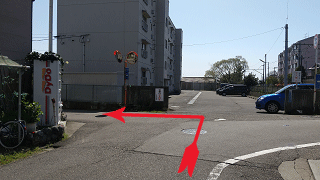 信号を通り過ぎてからの写真。駐車場は赤い所。